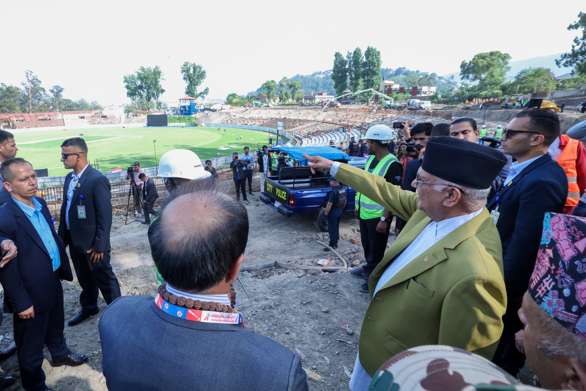 अनेरास्ववियुको महाधिवेशनका लागि कीर्तिपुर पुग्नुभएका प्रधानमन्त्री ओलीले त्यहाँबाट फर्किने क्रममा क्रिकेट रङ्गशालाको निरीक्षण गर्नुभएको हो ।