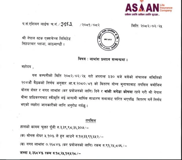 उक्त लाभांश नेपाल बीमा प्राधिकरणले स्वीकृत गरेपछि र कम्पनीको आगामी वार्षिक साधारण सभाले पारित गरेपछि सेयरधनीहरुमा वितरण हुनेछ।
