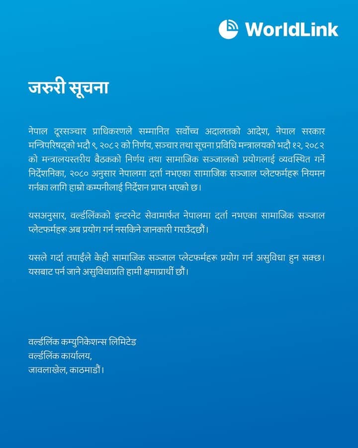 वर्ल्ड लिङ्कले शुक्रबार बिहान सूचना जारी गर्दै नेपाल दूरसञ्चार प्राधिकरणले सम्मानित सर्वोच्च अदालतको आदेश, नेपाल मन्त्रिपरिषद्को बैठकले गरेको निर्णय तथा सामाजिक सञ्जालको प्रयोगलाई व्यवस्थित गर्ने निर्देशिका, २०८० बमोजिम दिइएको निर्देशन बमोजिम उक्त प्लेटफर्महरु बन्द गरिएको बताएको छ ।