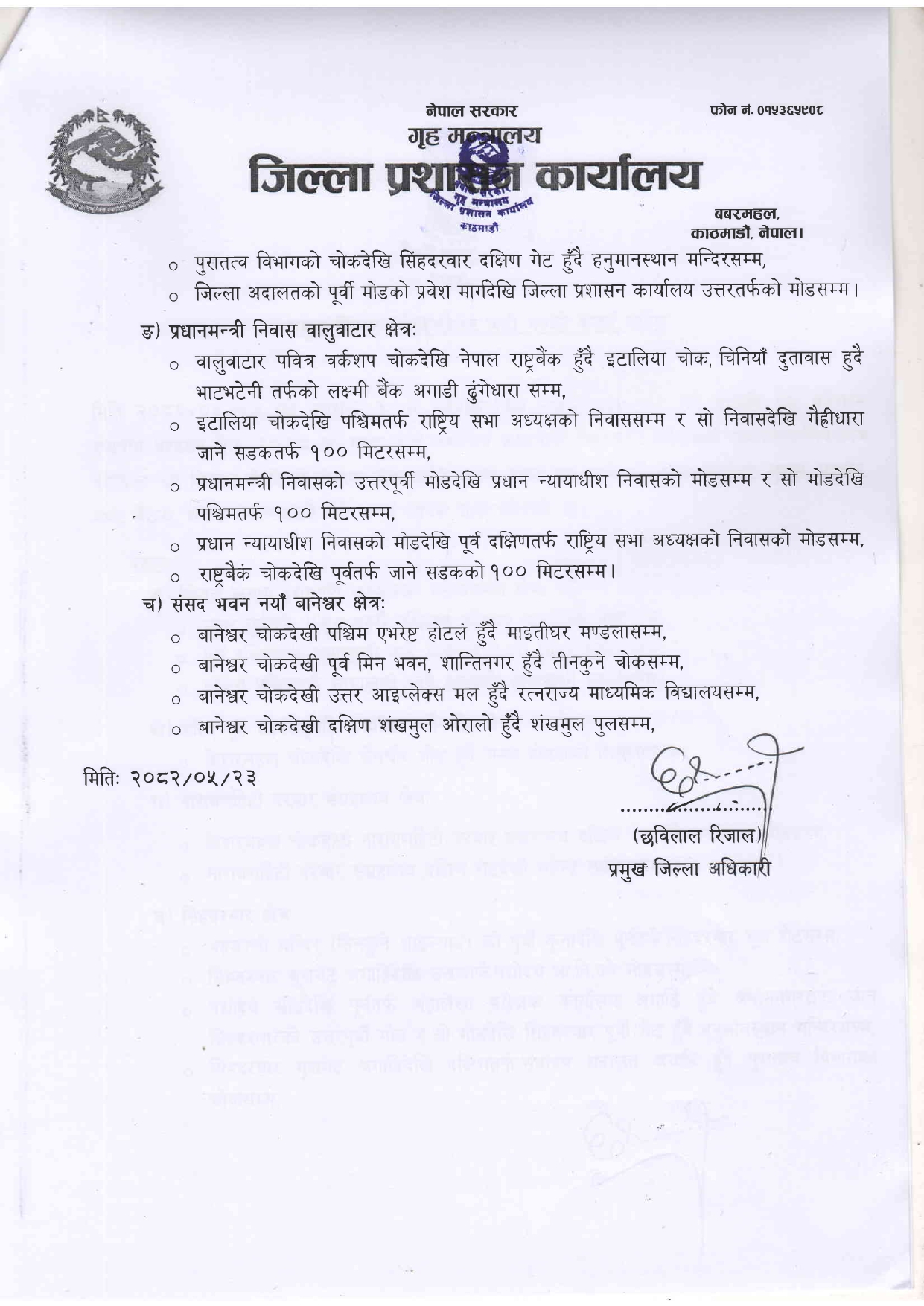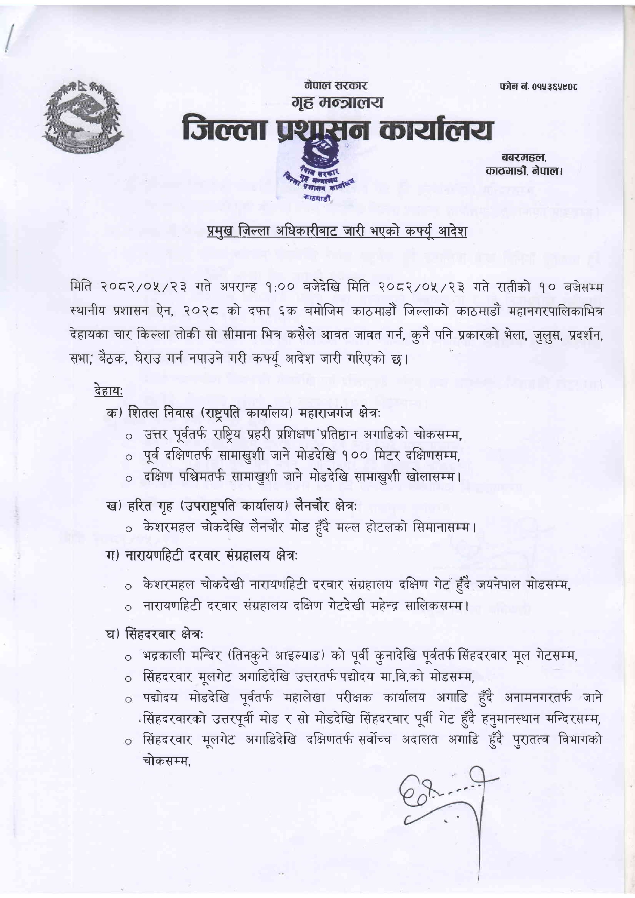 जिल्ला प्रशासन कार्यालयका अनुसार राष्ट्रपतिको कार्यालय शीतल निवास, उपराष्ट्रपतिको कार्यालय लैनचौर, नारायणहिटी दरबार सङ्ग्रहालय र सिंहदरबार क्षेत्रमा कर्फ्यू लगाएको हो । आज दिउँसो १ बजेदेखि राति १० बजेसम्म कर्फ्यू लगाइएको प्रमुख जिल्ला अधिकारीबाट जारी आदेशमा उल्लेख छ ।