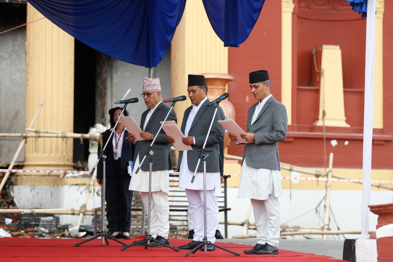 राष्ट्रपति रामचन्द्र पौडेलले राष्ट्रपति कार्यालय शीतल निवासमा आज आयोजित विशेष समारोहमा नवनियुक्त मन्त्रीहरु रामेश्वर खनाल, कुलमान घिसिङ र ओमप्रकाश अर्याललाई शपथ गराउनुभएको हो। राष्ट्रपति पौडेलले अन्तरिम सरकारका प्रधानमन्त्री सुशीला कार्कीको सिफारिसमा उहाँहरुलाई आइतबार साँझ नियुक्त गर्नुभएको हो ।