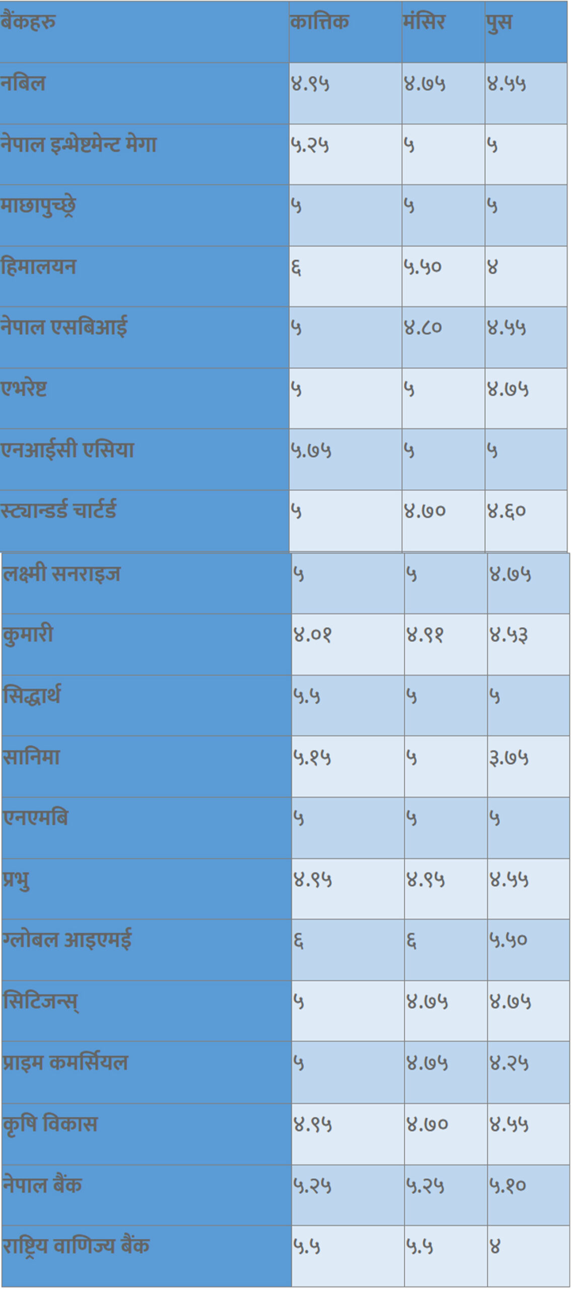 सात वाणिज्य बैंकहरूले (सिटिजन्स, माछापुच्छ्रे, एनआईसी एशिया, सिद्धार्थ, नेपाल इन्भेष्टमेन्ट मेगा, एनएमबि र हिमालयन बैंक) मङ्सिर महिनाकै अधिकतम ब्याजदरलाई निरन्तरता दिएका छन् । पुस महिनामा व्यक्तिगत मुद्दति निक्षेपमा ग्लोवल आइएमई बैंक र हिमालयन बैंकले अधिकतम ५.५ प्रतिशतसम्म ब्याज दिनेछन् ।