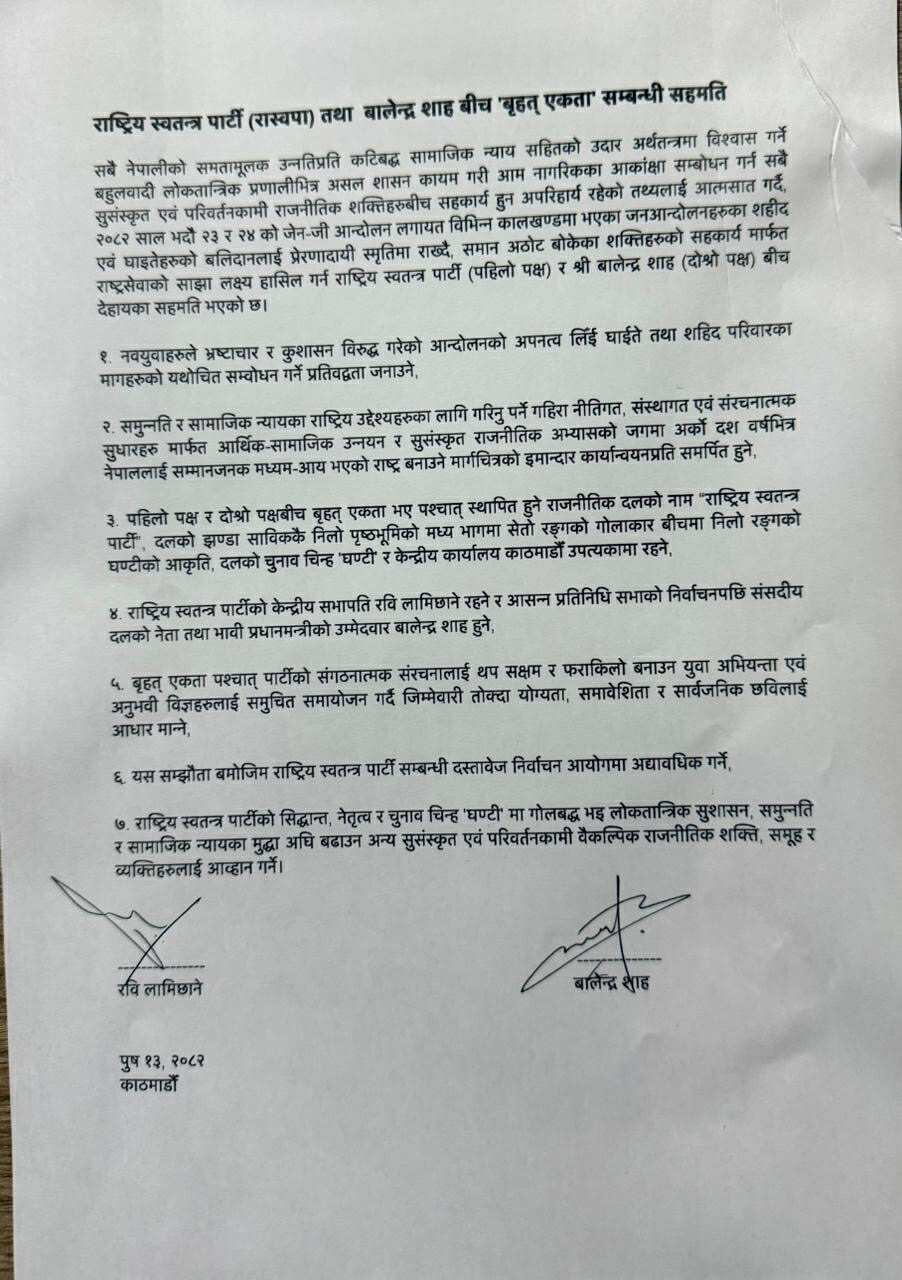 रास्वपा सभापति लामिछाने र काठमाडौँ महानगर प्रमुख शाहले एउटै दलमार्फत प्रतिनिधिसभा निर्वाचनमा जाने घोषणासहित आइतबार सात बुँदे सम्झौता गर्नुहुर्न भएको हो ।