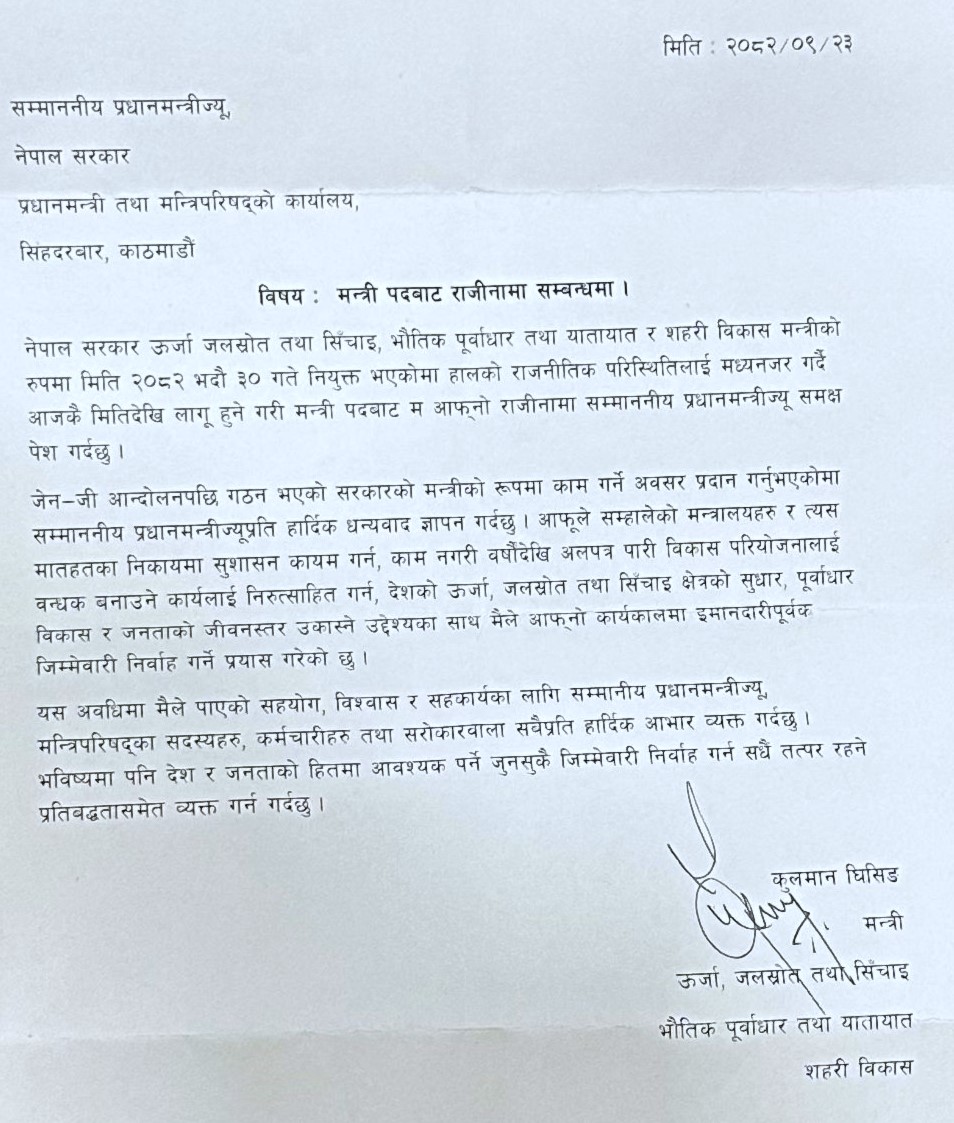 काठमाडौं- प्रधानमन्त्री सुशीला कार्कीसमक्ष ऊर्जा, जलस्रोत तथा सिँचाइ, भौतिक पूर्वाधार तथा यातायात र सहरी विकास मन्त्री कुलमान घिसिङले राजीनामा पेस गर्नुभएको छ। उहाँले बालुवाटारमा प्रधानमन्त्री कार्कीसँग भेट गरी बुधबार साँझ राजीनामापत्र बुझाउनुभएको हो। मन्त्री भएको ११५ दिनमा राजीनामा दिनु भएको हो ।
