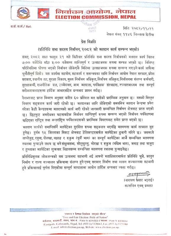 आयोगले बिहीबार साँझ मतदान सम्पन्न भएपश्चात् आयोजना गरेको पत्रकार सम्मेलनमा कार्यवाहक प्रमुख निर्वाचन आयुक्त रामप्रसाद भण्डारीले देशभर ६० प्रतिशत मत खसेको प्रारम्भिक अनुमान गरिएको जानकारी दिनुभयो ।